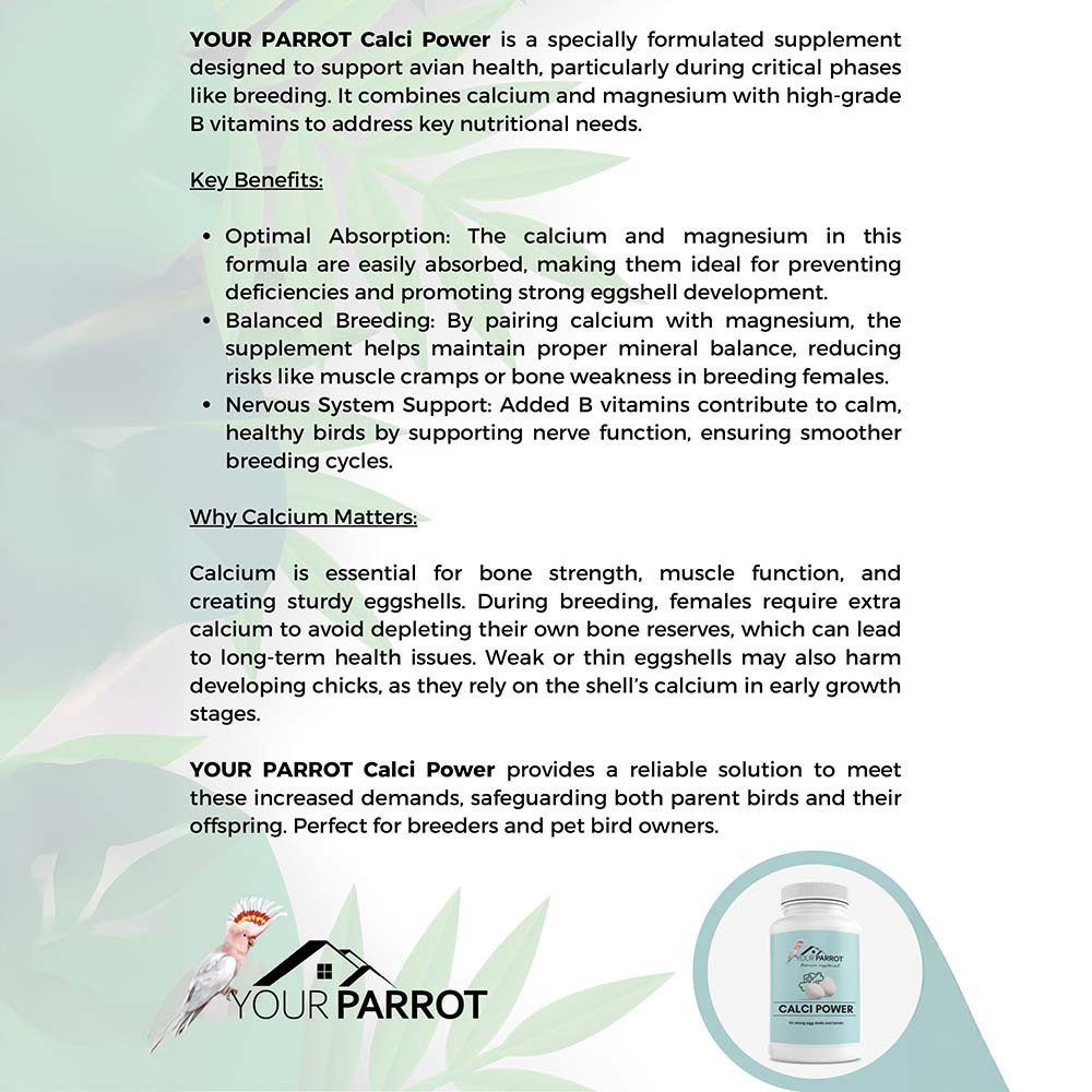 Your Parrot Supplement Calci Power (500g Powder) is a specially formulated supplement to support avian health, particularly during critical phases like breeding. It combines calcium and magnesium with high-grade B vitamins to address essential nutritional needs.