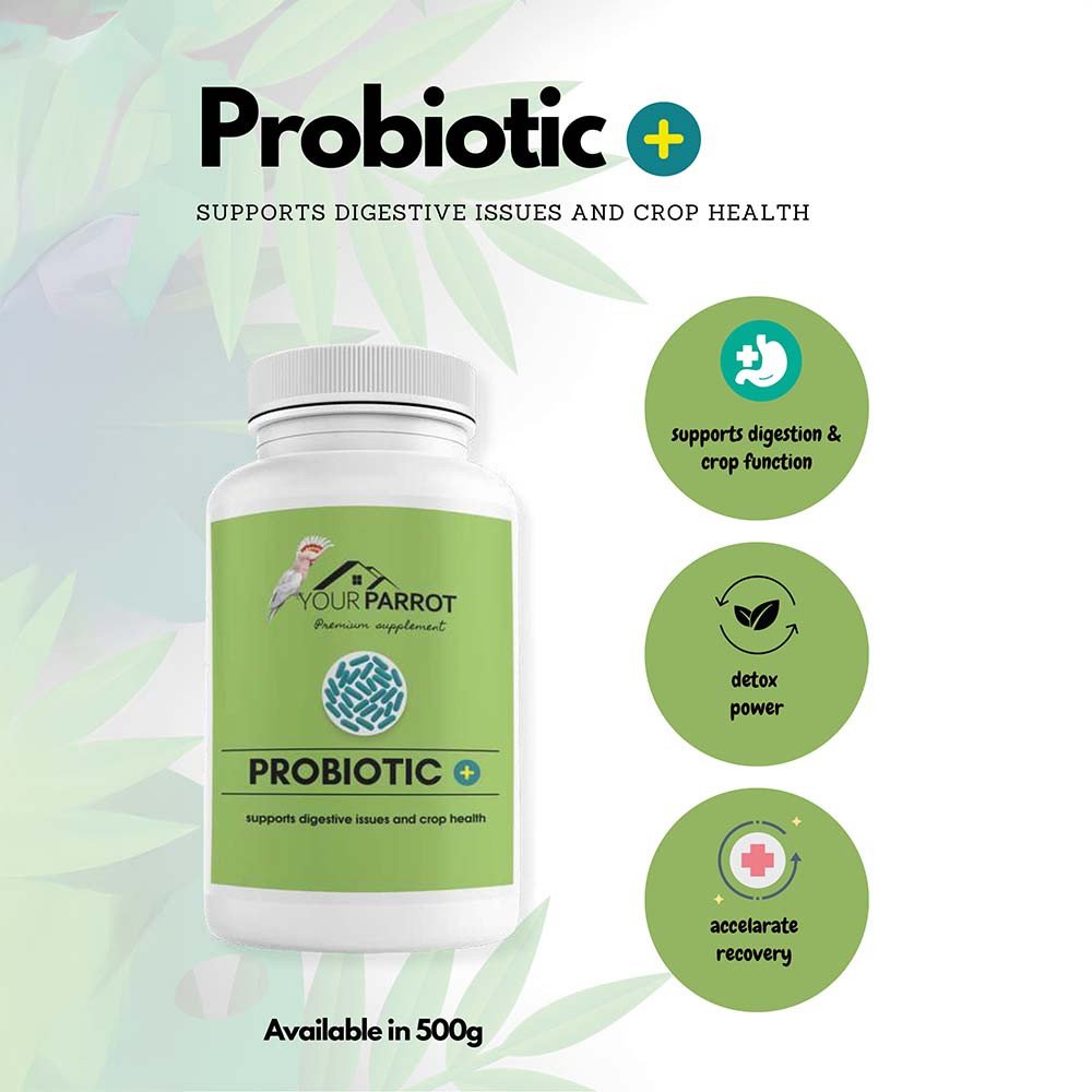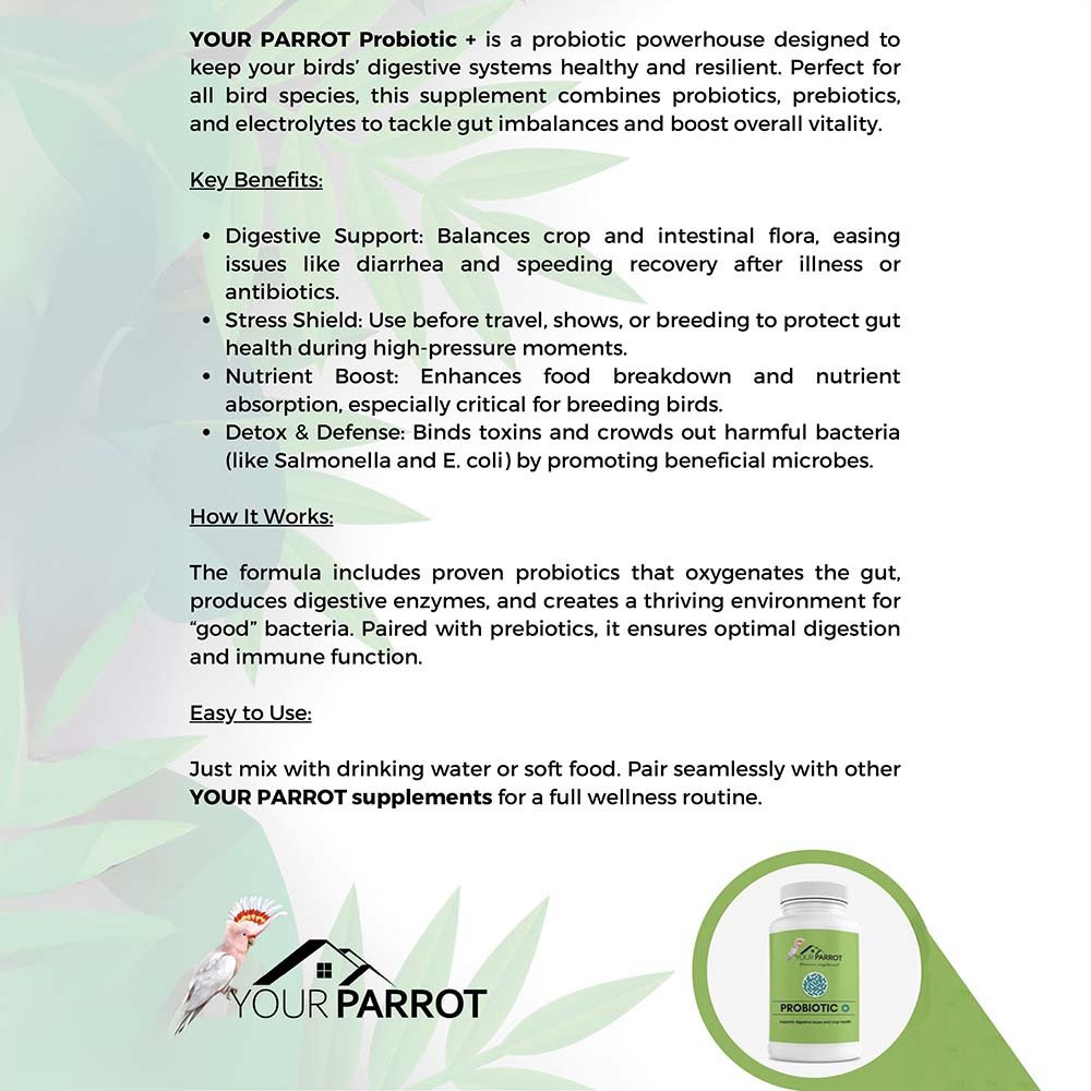 Your Parrot Supplement Probiotic+ (500g Powder) is a water-soluble probiotic formula designed to maintain a healthy, resilient digestive system in all bird species. Combining probiotics, prebiotics, and electrolytes, it helps correct gut imbalances and supports overall vitality.